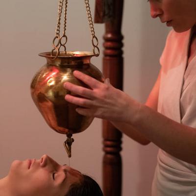 Soin emblématique de l'Ayurveda qui consiste en l'application d'un filet d'huile de sésame régulier sur le front, pour un mental apaisé.